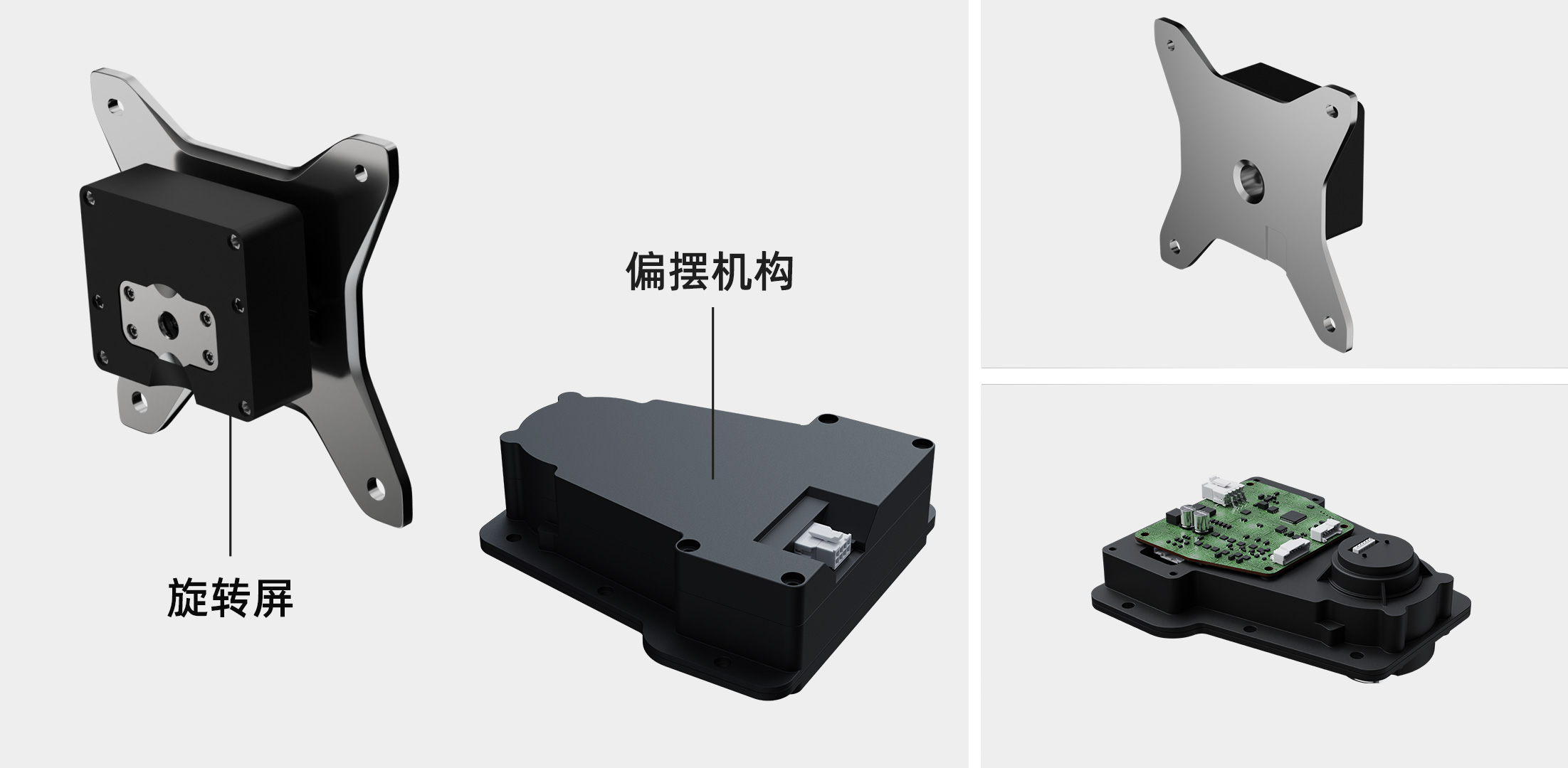 - 采用直流电机+平行传动+蜗轮蜗杆进行传动以提升减速增力,从而实现车内屏可旋转、偏摆角度,达到使用其后体验感较优的效果。